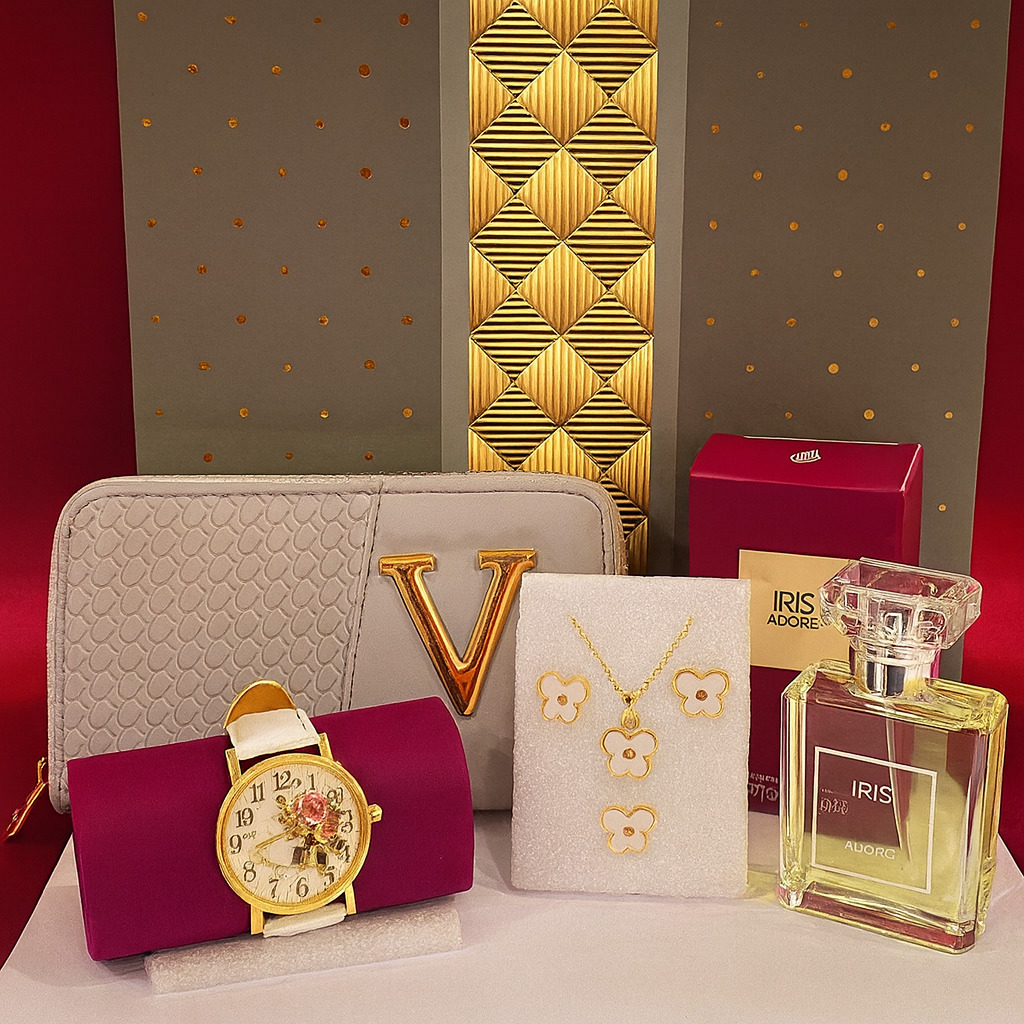 Radiant, refined, and effortlessly elegant — the Golden Iris Gift Set is a perfect expression of sophistication and charm. This beautifully curated collection includes a stylish grey wallet with golden detailing, a floral-patterned wristwatch, a delicate gold-toned necklace and earring set, and the exquisite Iris Adore perfume that captures a soft, feminine allure. Thoughtfully presented in a luxurious package, it’s the ideal gift for birthdays, anniversaries, or any moment worth celebrating with grace and beauty.