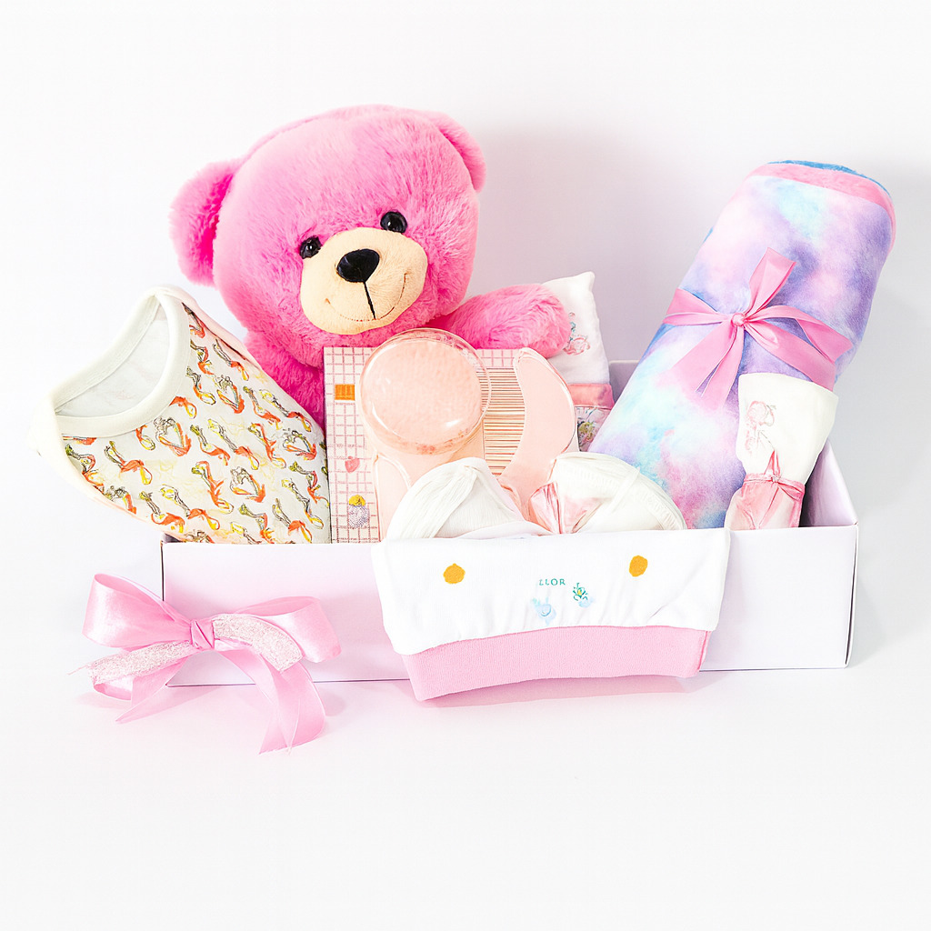 Inside this beautifully arranged gift box, you’ll find everything a new parent needs for their baby girl’s first days of love and laughter: