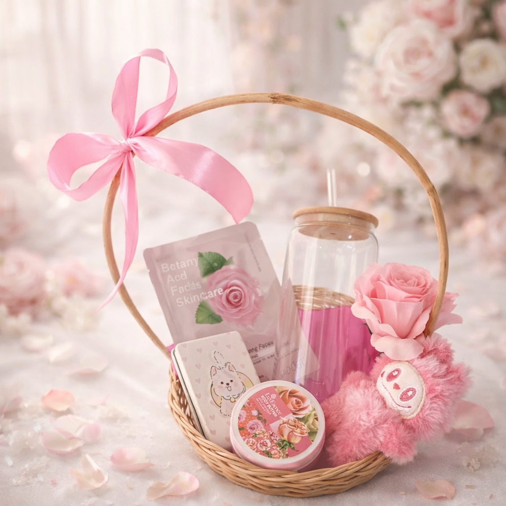 Refreshing Face Mask: Enjoy a soothing skincare moment.Makeup Mirror: For easy touch-ups, design may vary.Love Essence Rose Body Butter: Keeps skin soft and fragrant.Decorative Artificial Rose: Adds lasting beauty.Stylish Reusable Glass Bottle: Includes a wooden lid and straw.Adorable Labubu Toy: Color may vary for a fun surprise.