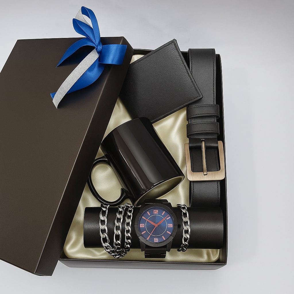 Beautifully presented in a sleek black gift box, each piece has been thoughtfully selected to complement his everyday style and enhance his confidence.
